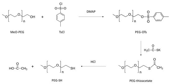 PEG-SH was synthesized according to a method described elsewhere [] carried out in three steps. Tosylation of PEG550 was carried out by mixing 30 g of MeO-PEG550 (54.5 mmol) and 33 mg of 4-dimethylamino pyridine (DMAP) (2.7 mmol) dissolved in 160 mL of CH2Cl2/pyridine (1:1) solution at 0 °C under argon atmosphere. Furthermore, 18.7 g of 4-toluenesulfonyl chloride (TsCl) (98.1 mmol) was dissolved in 50 mL of CH2Cl2 and added dropwise and the solution was stirred overnight until brought back at RT. Then, 200 mL of cold water were added and the aqueous phase was extracted 3 times with 150 mL of CH2Cl2. The accumulated organic phases were washed successively with 3 × 250 mL of a 1M HCl solution and 3 × 250 mL of a saturated NaCl solution. The solution obtained was dried over MgSO4 and then concentrated under reduced pressure to obtain 37.2 g of product (PEG550-OTs). To carry out the synthesis of PEG550-thioacetate, 37.2 g of PEG550-OTs (53 mmol) was dissolved in 200 mL of THF under argon. Then, 11.6 g of potassium thioacetate (102 mmol) was added and the solution was refluxed for 20 h, inducing the formation of a white precipitate. After returning to RT, 400 mL of water were added. Contents of the flask were extracted with 3 × 150 mL of CH2Cl2 and the organic phase was washed with 3 × 200 mL of water, treated with activated carbon, filtered and evaporated until an oil was obtained (15.3 g, yield 36%).