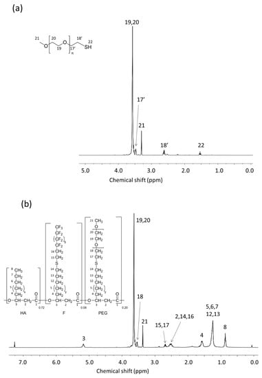 1H NMR spectra in CDCl3. (a) PEG550-SH; (b) PHA-g-(C8F17; PEG).