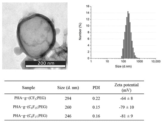 Negative staining improved the TEM image contrast and allowed the visualization of the inner core in PFOB in light gray whereas the polymeric shell seemed darker, which confirmed the core-shell structure (Figure 8). Images show spherical objects with size in good agreement with the diameter measured by dynamic light scattering DLS. Smooth surfaces are observed for all particles. DLS measurements showed that the average size of PHA-g-(F; PEG) PFOB nanoparticles increased from 246 nm for the perfluorodecane graft to 294 nm for the trifluoropropane graft. The increase of the length of the fluorinated side chains certainly improves the interactions between these hydrophobic moieties. A wider distribution of sizes was also observed. All samples present very negative zeta potential regardless of the length of the perfluorinated groups, resulting in a very good stability in aqueous medium with a low tendency to aggregation [].