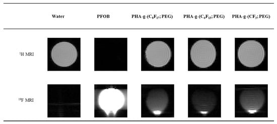 Phantom MRI studies were performed to evaluate in vitro the contrast properties of PFOB nanocapsules from different PHA-g-(F; PEG). These nanocapsules were dissolved in distilled water and different acquisition times were evaluated: 1 min 31 s, 15 min 10 s, 1 h 16 min and 10 h. It turns out that from 15 min 10 s, nanocapsules solutions are distinctly visible and as detectable as after 10 h of acquisition. This relatively short analysis time is very encouraging to consider a further clinical application even though fluorine concentration would probably by lower after an injection in vivo. The 1H MRI and 19F MRI images thus acquired in 15 min were presented in Figure 9. A more intense signal is observed at the bottom of the images due to the nanocapsules sedimentation during the different acquisitions. One of the simple solutions to increase the visibility in MRI could be to increase the number of fluorine atoms per nanocapsule. Here, the number of F atoms varied from 3 to 17 per grafted fluorinated segment for the three imaged nanocapsules. The results obtained show that this is not a determining parameter because the particles are visible whatever the length of the grafted fluorinated segment. The CF3 is volatile, which can appear as a disadvantage during the grafting reactions and therefore it would be preferable to use C6F13 or C8F17. The preliminary results showed that these PFOB nanocapsules could be used as contrast agents for MRI.