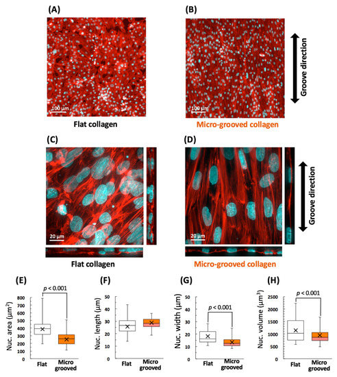 Typical fluorescent images of vascular smooth muscle cells (VSMCs) cultured on either the flat (A) or micro-grooved (B) collagen (col) substrate. Actin filaments and nuclei were visualized using Alexa Fluor–conjugated phalloidin (red) and Hoechst 33342 (cyan), respectively. Examples of confocal fluorescent images of VSMCs cultured on either the flat (C) or micro-grooved (D) collagen substrate for 3 days. The obtained stacked cross-sectional images of the cells were converted to superimposed projection 2D images and their reconstructed lateral images. Shapes of the nuclei were quantified via these confocal images (E–H). Over 500 cells were analyzed in each group. (Flat, n = 505 cells; Micro-grooved, n = 530 cells).
