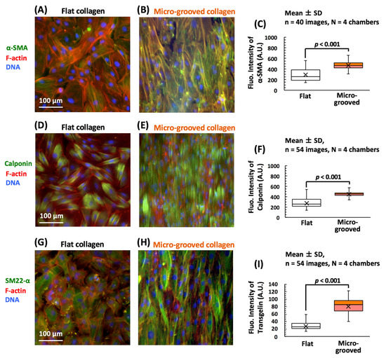 By fluorescent image analysis, we next assessed the impact of the tissue-like cell alignment (caused by micro-grooved collagen) on VSMC differentiation (Figure 3). Fluorescence intensity levels of vascular-smooth-muscle contractility markers such as α-SMA (Figure 3A,B), calponin (Figure 3D,E), and transgelin (Figure 3G,H) were significantly higher in the aligned VSMC tissue on the micro-grooved collagen substrate, and the increase in these levels was statistically significant (Figure 3C,F,I). In particular, for transgelin, which is negatively regulated by globular actin [28], the upregulation was the most prominent, suggesting that stabilization of the filamentous structures of the actin cytoskeleton might be facilitated on the micro-grooved collagen substrate. These findings meant that the cultivation on the micro-grooved collagen substrate significantly induced VSMC differentiation with phenotypic transition (from the synthetic phenotype to contractile phenotype).