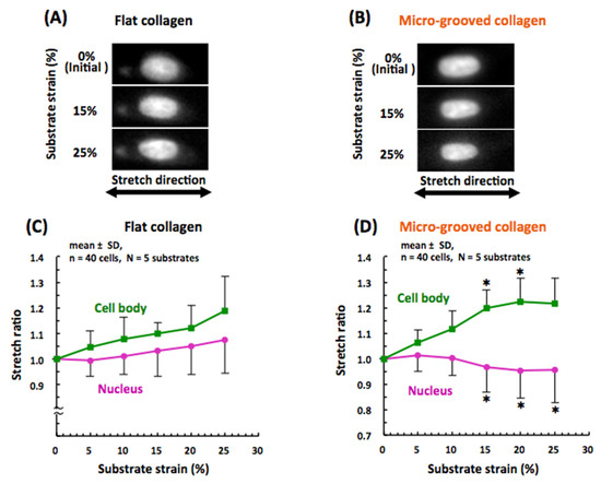 Examples of fluorescent images of a Hoechst-stained nucleus in vascular smooth muscle cells (VSMCs) cultured on either the flat (A) or micro-grooved (B) collagen substrate during macroscopic substrate stretching. The stretch ratio of the cell body and nuclear length of the VSMCs cultured on either the flat (C) or micro-grooved collagen (D) substrate; these data are plotted against the macroscopic substrate stretch. Asterisks in (D) indicate statistical significance compared with the cells on the flat collagen (C), as determined by Student’s t-test (* p < 0.05).