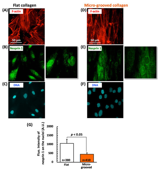Typical fluorescent images of the actin filaments (red), nesprin 1 (green), and the nucleus (blue) in the vascular smooth muscle cells (VSMCs) cultured on either the flat (A–C) or micro-grooved (D–F) collagen substrate for 3 days. The right panels in (B,E) represent magnified images of nesprin 1 around the nuclei. Changes in the expression of nesprin 1 in the VSMCs on micro-grooved collagen (G). The numbers (n) represent the numbers of analyzed cells. We used 4 dishes in each group.