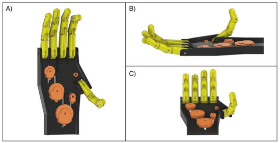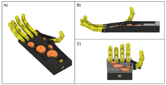 3D renderings of the “Federica” prosthetic hand: (A) Top view; (B) Side view; (C) Bottom view.