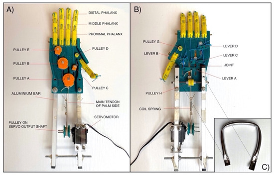 The mechanical system is equipped with two main tendons: one actuator (palm side) and one antagonist (back side) to perform, respectively, the closing (fingers flexion) and opening (fingers extension) of the hand. Both tendons are connected to the same pulley on the servomotor’s output shaft (see Figure 3A), so that, when one is pulled, the other is released, and vice-versa. In particular, in the back side (see Figure 2C,D), the traction force used for the extension of the fingers is distributed by using levers. A coil spring with low elastic constant (K ≈ 2.5 N/mm) is inserted on the main tendon of the back side (see Figure 2C), in order to allow the complete flexion of the fingers, which is otherwise not possible by using inextensible cables (tendons).
