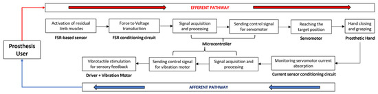 Figure 5 shows the closed loop for the prosthesis user, made by combining the force-myographic control and the vibrotactile sensory feedback. In particular, both the “efferent pathway” (from the contraction of the target muscle to the execution of the grasp action) and the “afferent pathway” (from the sensing of the servomotor current absorption to the vibrotactile stimulation for the sensory feedback of the grip force) are presented.