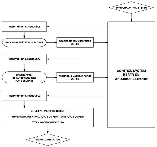 The control system was implemented on an open-source Arduino platform (Arduino Nano). The whole system is powered by a 7.4 V battery pack. Each time the prosthesis is worn, a simple calibration procedure is recommended: while remaining at rest for two seconds, the mean minimum force value applied on the FSR-based sensor is acquired and stored; then, while exerting the maximum voluntary contraction for two seconds, the mean maximum force is acquired and stored. The user can be guided in this calibration phase by means of a vibration motor (or by a buzzer), which signals when the patient must contract the muscle. Figure 7 depicts the entire calibration phase as a flowchart. After calibration, the prosthesis is ready to work.