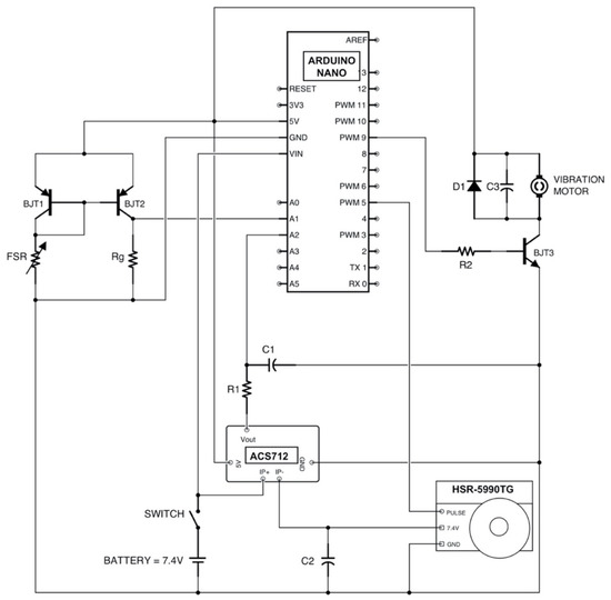 The simple circuit to drive the vibration motor is showed in a section of Figure 8. A npn BJT (BJT3) is used to amplify the driver current supplied from the Arduino to the vibration motor; on the other hand, a 1 KΩ resistor (R2) in series with the base of the transistor, is also used for limiting this current and avoiding motor damages. The diode (D1) acts as a surge protector for the microcontroller against voltage spikes that the motor could produce while rotating, and a 0.1 μF ceramic capacitor (C3) absorbs these voltage peaks.