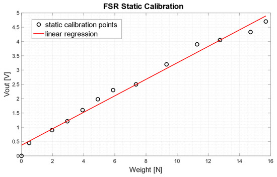 Results of the static FSR calibration are showed in Figure 10. Experimental measurements are represented as circles, while linear regression is represented as a red continuous line. Considering the weights applied to the sensor to be x (N) and the output voltage from the conditioning circuit to be y (V), the equation of the linear regression resulted: