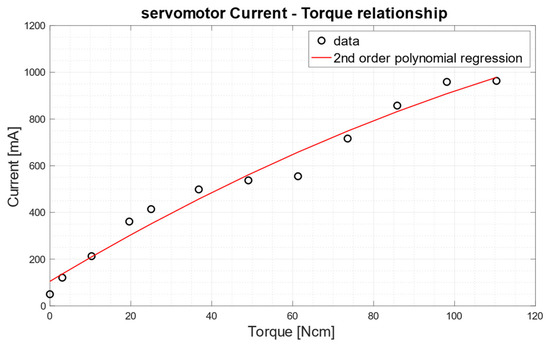 The relationship was approximately linear to about 100 N·cm, whereas, for higher torques, the absorbed current saturates at about 950 mA. A second-order polynomial function well fits the current–torque scatter plot, with a coefficient of determination R2 equal to 0.973. The equation of this second-order polynomial regression function is: