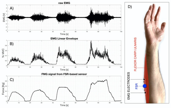 Simultaneous recordings from the forearm muscle “flexor carpi ulnaris”, while performing four wrist flexion movements with increasing strength: (A) Raw EMG signal; (B) EMG linear envelope; (C) FMG signal from FSR–based sensor; (D) FSR–based sensor and EMG electrodes positioned on the flexor carpi ulnaris of the subject’s forearm.