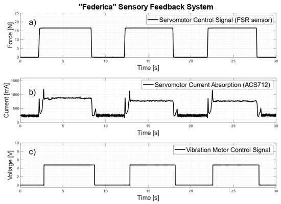 Figure 13 shows simultaneous recordings of FSR-based sensor output (N), servomotor current absorption (mA) and vibration motor control signal (V). The FSR-based sensor (see Figure 13a) was triggered by exerting a first impulsive and then constant force (about 16N), in order to quickly activate the closure of the prosthetic hand and keep the grip on an object for some seconds. The current absorbed (see Figure 13b) by the servomotor shows a first peak at the motor starting (to overcome static friction) and a second peak when the prosthetic fingers reach the object; then, the current value stabilizes at about 800 mA for the entire holding time. The panel (c) of Figure 13 shows the activations of the vibration motor, corresponding to three consecutive grasps.