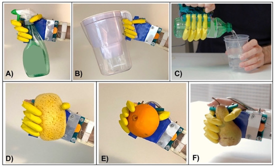 “Federica” hand tested on healthy subjects, while holding: (A) a spray cleaner; (B) a water tank; (C) a bottle; (D) a sponge; (E) an orange; (F) a pear.