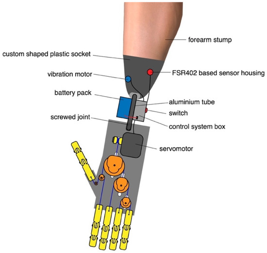 Figure 16 illustrates a possible arrangement of the prosthetic device combined with a 3D-printed socket for the arm stump. In the proposed design, the socket embeds the FSR-based sensor housing, in correspondence with the muscle assigned to the control. An aluminum tube, fastened in the distal part of the socket, ends with a screwed joint which is fixed in an ad-hoc slot of the hand prosthesis. The vibration motor for providing the sensory feedback of the grip force [9,30], is attached to the external surface of the socket. The battery pack (removable) and the control system box are hooked around the aluminum tube. Finally, the switch to activate the device is located on the control system box.