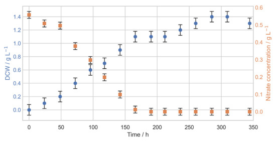 A photobioreactor cultivation of Synechocystis sp. PCC 6714 under nitrogen-limiting conditions showing the DCW (blue) and nitrate concentration (orange) during process. Error bars reflect the error of calibration curve.