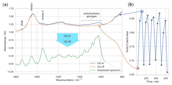 Typical process FTIR spectra. (a) Two selected spectra with activated (blue) and deactivated US capture (orange) are depicted on top. Subtraction yielded pure spectra of Synechocystis sp. 6714, shown at bottom (green). (b) Integrated signal from the Amide II band, showing modulation occurring when US trap was in pushing mode vs. retracting mode.
