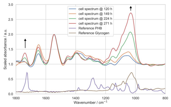 In these subtracted spectra, the accumulation of PHB in the cell during the nitrogen deprived cultivation became clearly visible, as the band attributed to the carbonyl stretch of the PHB at 1738 cm−1 was free standing and could thus be used directly for determination of the PHB content. It was in good agreement with the reference spectrum obtained by direct measurement of PHB powder (Figure 3).