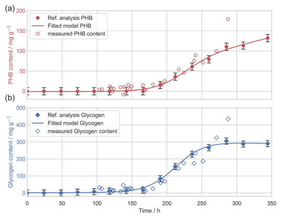 Trend of accumulated storage compounds during Synechocystis sp. PCC 6714 cultivation. (a) In-cell PHB; (b) glycogen content. Reference analysis was performed offline (filled markers). Profile was modeled to extracted reference points for caught spectra. In-line measured quantities are depicted as unfilled markers. Error bars reflect error of calibration curve.