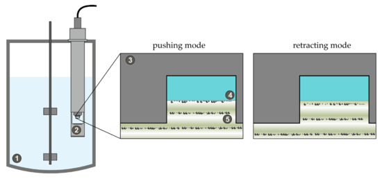 In a typical in-line ATR probe, light in the mid-IR region from 400–4000 cm−1 is totally reflected within the diamond tip. This results in an evanescent field that penetrates approximately 1–2 μm of the cultivation broth and interacts with all molecules [17]. The changes in light intensities are recorded, and the spectra can be evaluated by univariate calibration or chemometric tools [16,18]. ATR-FTIR instruments are commercially available, and applications for in-line, on-line, or at-line monitoring are established PAT tools, e.g., for P. chrysogenum or E. coli processes [19,20,21]. Further, ATR-FTIR studies were done for characterization of PHAs [22], and for PHB production processes using bacteria [23,24,25]. In general, a specific cell spectrum in liquid culture is only achievable if the evanescent field is mainly populated by cells. Usually in stirred cultivation broths, only the liquid constituents are accessible. Different strategies were employed to selectively enhance the signal attributed to the cells, e.g., using an on-line loop to bring medium through a flow cell equipped with an ATR-element. By selectively stopping the flow, cells settle on the ATR element and are then accessible for analysis with ATR-FTIR spectroscopy. This was shown for quantification of PHB in E. coli [24]. After the measurement, the cells are resuspended as flow is re-established. This prolonged procedure could influence the cells due to oxygen or nutrient limitations, as well as produce biofilms as cells are not efficiently resuspended. To avoid these effects in biotechnological processes ultrasound (US) particle manipulation devices can be used [26].