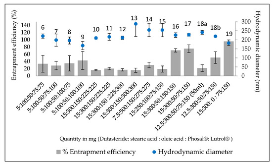 Formulations 1–19 were produced in ascending numerical order in order to determine which formulation had the optimal characteristics, in particular the highest associated entrapment (Figure 1). The first five formulations showed visible aggregation (data not shown), and were not considered for further analysis. Formulations 10–13 were an upscale of formulations 6–9 by a factor of three, in order to improve the precision of the results (lower than LOQ using HPLC). A clear reduction in the entrapment efficiency was observed due to this upscale. No significant differences (p > 0.05) were observed in the entrapment efficiencies of Formulations 10–13.