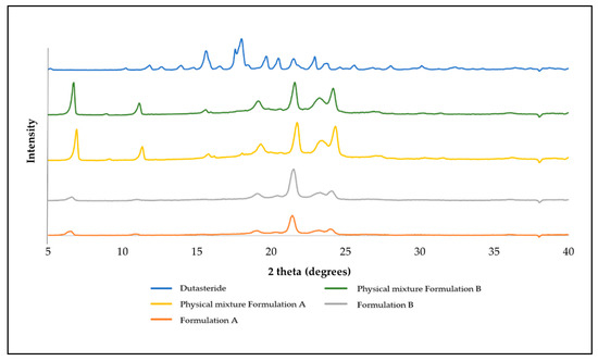 Based on Figure 3, the XRD pattern showed several peaks at the 2θ value of dutasteride, specifically, the peaks at 15.6 and 17.9° 2θ demonstrated the crystalline nature of dutasteride. The diffractograms of the physical mixtures were less visible at that intensity, suggesting that in the physical mixture, the drug was present in a less crystalline form. Other peaks were observed, in particular, 6.9, 11.3, 19.3, 21.7 and 24.2° 2θ; which common to both formulations, suggesting that other materials were most likely responsible for these, as they were not present in the diffractogram for the dutasteride.