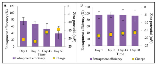 Stability test for entrapment efficiency over 50 days for Formulation A and B.