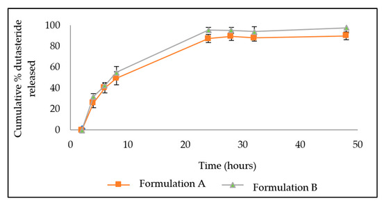 Dutasteride release from DST-LNP for Formulation A and B over 48 h.
