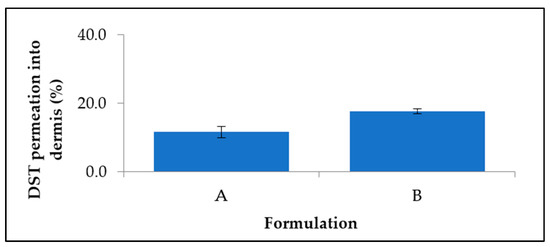 In vitro permeation studies using porcine ear skin were conducted to mimic human skin. Porcine ear is a good in vitro model for human skin, as it presents a similar penetration for topically applied substances. The receptor chamber of the Franz diffusion cell did not contain any dutasteride when tested for permeation by HPLC. This suggests that the drug may not penetrate deep enough to reach the capillaries, which has the advantage of reducing systemic absorption and side-effects. Previous attempts to formulate finasteride into LNP showed similar results, i.e., negligible quantities of finasteride permeated into the receptor, although the content in the dermis itself was not analysed [20]. For both samples, <20% of the drug permeated into the dermis after 48 h (Figure 7). The rest of the drug was localised in the donor compartment and the stratum corneum site. Formulation A had an average permeation of 11.5 ± 1.7% with significant difference with Formulation B, which had 17.7 ± 0.7% permeation, suggesting that dutasteride delivered in a smaller quantity of liquid lipid achieved higher permeation into the dermis. As suggested in a previous study, the improvement of skin permeation effectiveness is influenced by both drug partitioning between the skin and vehicles, and drug–vehicle interactions. Solid lipids which form highly crystalline particles with a perfect lattice might result in drug expulsion [21].