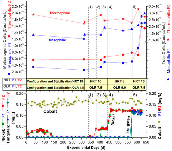 The stable pH conditions in this work are similar to the situation in large-scale biogas plants, characteristic of having high amounts (>60%) of natural manure and other types of substrates. However, to prevent and overcome any risk of an imbalance, the OLR in period 5 (570–640 day) was reduced from 9.0 to 7.5 gVS/L/day (Figure 2). In contrast, the observed increased cell counts revealed that the simultaneous rise in VFA caused no real instability (Table 5). This new insight, with respect to the number of microbial cells, contradicts the general operating experience [12,13] and illustrates that the sensitive VFA level should be not over-interpreted for process imbalance. The successive nickel addition in periods 1–3 (fermentation 370–540 day), with an HRT of 10 days, resulted in the rise of methanogenic cells from 2.5 × 108 to 4.9 × 108 cells per mL in the mesophilic fermenter F1, as well as from 5.8 × 108 to 6.5 × 108 in the thermophilic fermenter F2 (Table 5, 311 and 423 day).
