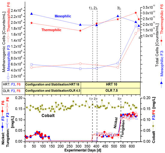 The supplementation strategy in Figure 3 was different from Figure 2, because in Figure 3 simultaneous supplementation of nickel and tungsten was conducted, instead of a successive increase of nickel dosage, with the final adding of tungsten. The modified supplementation strategy for the mesophilic fermenter F3 and thermophilic fermenter F6 was bundled in three longer fermentation periods, from 380–640 day, with a uniformly constant high OLR of 7.5 gVS/L/d and concomitant HRT of 10 days. However, the same final concentrations of nickel and tungsten were adjusted, as presented in Figure 2, with successive supplementation.