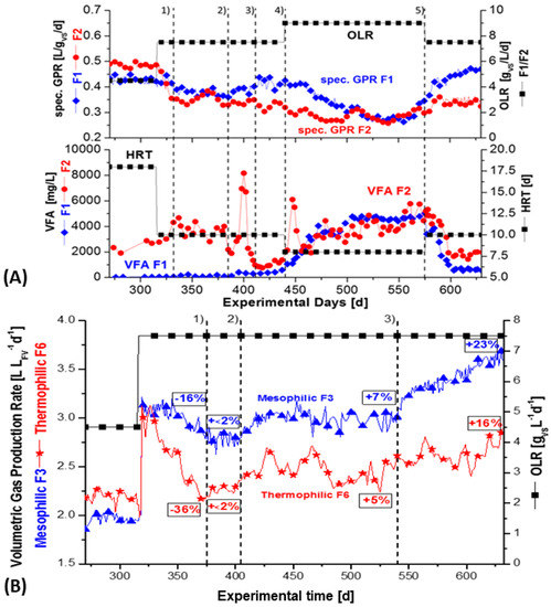 However, the pH was stable between 7.3–7.6 and cell counts still increased between 440–570 days (Table 5, sampling time 423 and 521 d). It showed that the sensitive VFA level alone should not be indicator of process imbalance. The buffer capacity should also be considered. However, the buffer capacity is a very slow indicator [10]. Furthermore, after adding tungsten in the last fermentation period 5, the specific GPR increased in the mesophilic fermenter F1 from about 0.155 to 0.230 L/gVS, whereas it slightly increased in the thermophilic fermenter F2 from 0.146 up to 0.179 L/gVS (Figure 4A). Thereby, as expected, the VFA concentration decreased from 4000 to 1000 mg/l in the mesophilic fermenter F1 and decreased from 6000 to 2000 mg/L in the thermophilic fermenter F2 (Table 6 and Table 7, column 4).