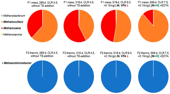 - Wintsche, B.; Jehmlich, N.; Popp, D.; Harms, H.; Kleinsteuber, S. Metabolic adaptation of methanogens in anaerobic digesters upon trace element limitation. Front. Microbiol. 2018, 9, 405. [Google Scholar] [CrossRef]