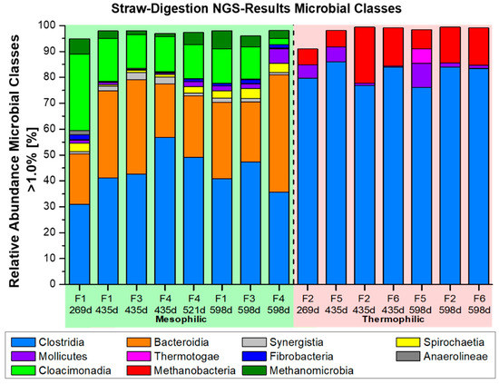 Furthermore, the list of major players (>3%) for straw digestion could be continued, with the abundance of 3–25% by the mesophilic Caldicoprobacter and up to 7% by the unclassified Clostridium genus DTU014_ge. Additionally, the syntrophic thermophilic Syntrophaceticus played, with 3–9% contribution of the abundance list >3%, a major role (Figure 7A). Interestingly, these three genera, including MBA03_ge, were observed in a thermophilic municipal biowaste digester study, too [56]. According to the authors [56], the probable reason for the abundance of the three genera, during the long-term fermentation of biowaste, was the replacement of acetoclastic methanogenesis by syntrophic acetate oxidation, combined with hydrogenotrophic methanogenesis. This view coincides quite well with the parallel, predominant occurrence of the hydrogenotrophic genus Methanoculleus and Methanothermobacter, under both mesophilic and thermophilic conditions of straw digestion (Figure 5).
