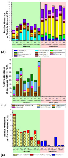 The high frequency of the clostridial cluster genus MBA03_ge, with 6–29% abundance in the list of the major genera with >3% abundance, was also outstanding. MBA03_ge was recently reported to play a dominant role, with up to 21% abundance in the anaerobic degradation of lignocellulosic grass [61] and during anaerobic degradation of a typical municipal thermophilic biowaste, including assorted lignocellulosic garden and vegetarian kitchen residues [56]. Our discovery of this genus was more a coincidence. First, this novel genus was not detected in all samples, as the Silva database nr119 (from 2017) was applied (see Section 2.4). However, the re-assessed informatics evaluation of the same molecular sample, with the more updated Silva database nr132 (version from 2019), exhibited the unexpectedly high abundance of MBA03_ge, as seen in Figure 7A.