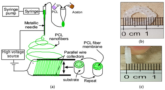 Polycaprolactone (PCL) is a non-toxic, biodegradable polymer with good biocompatibility. PCL is one of the ideal materials for preparing nanofibers using an electrospinning process that provides it with high biocompatibility [16]. Electrospinning is a process by which fibers (micro to nanometer diameter) can be obtained from an electrostatically driven jet of polymer solution through a charged needle [17]. The high surface area-to-volume ratio of the fiber matrix provides an advantage in industrial applications such as barrier fabrics, wipes, and other medical/pharmaceutical uses [18,19,20,21]. In our previous research, we functionalized PCL with CG1 to increase its biological functionality [22]. We have developed a process [23] to create a membrane where multiple layers of aligned polycaprolactone (PCL) electrospun nanofibers (ENF) are harvested and applied to any substrate [23]. Two parallel wires were used to collect a single layer of aligned PCL fibers by electrospinning a PCL solution (Figure 1). The fibers were harvested at different angles and stacked in layers on a substrate to produce a PCL nanofiber membrane (NFM). According to our developed method, hydrogel membranes can be coated on all sides using PCL NFM to produce a PCL-coated hydrogel scaffold. The unique nature of the nanofiber-hydrogel scaffold is that any custom size and shape of tissue engineering graft (such as ear, nose, lips, or skin) can be produced from this method. Designing and developing pro-angiogenic electrospun PCL nanofibers and evaluating their usefulness in various tissue engineering and regenerative medicine settings is an active field of research [24]. Bazzolo et al. [25] conducted breast cancer cell cultures on electrospun PCL as a potential tool for preclinical studies on anticancer treatments. Various electrospun nanofibers made of natural and synthetic polymers are often used to incorporate biomolecules and peptides to improve the physico-chemical/mechanical and biological properties of PCL fibers. Abebayehu, D. et al. [26] reported improvement of angiogenic responses by adding vascular endothelial growth factor (VEGF), basic fibroblast growth factor (bFGF) with PCL. The study by Dettin M et al. [27] investigates the influence of increasing concentrations self-assembling peptides (SAP) with PCL on the physico-chemical, mechanical and biological properties of PCL fibers. The study found that, as compared with bare PCL, SAP enrichment increased the number of metabolic active h-osteoblast cells, fostered the expression of specific osteoblast-related mRNA transcripts, and guided calcium deposition, revealing the potential application of PCL-SAP scaffolds for the maintenance of osteoblast phenotype [25].