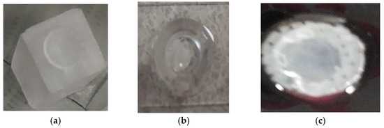 (a) PCL NFM coated PEGDA scaffold on an acrylic mold; (b) Cured SA gel on microscopy slide; (c) A PCL coated CG1 sample on a plastic ring.