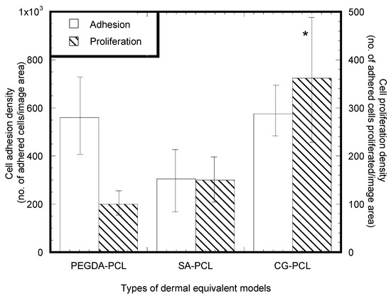 Mean cell adhesion density (±standard error) and mean cell proliferation density (±standard error) for the PEGDA-PCL, SA-PCL, and CG1-PCL groups. Data are presented with n = 8 for all samples. Note: * p < 0.05 (compared to PEGDA-PCL).