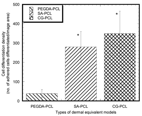 Mean cell differentiation value (±standard error) for the PEGDA-PCL, SA-PCL, and CG1-PCL groups. Data are presented with n = 8 for both samples. Note: * p < 0.1 (compared to PEGDA-PCL).