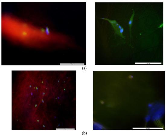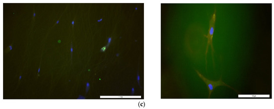 This study used human dermal fibroblasts (LifeLine Technology, Frederick, MD, USA) HDF 01035). Cells were cultured on tissue culture dishes in standard culture conditions (37 °C in a 5% CO2 incubator). The cell medium consisted of DMEM/high glucose, 5% FBS and 1% penicillin/streptomycin/amphotericin (Sigma-Aldrich, St. Louis, MO, USA) was used for all studies. Cells were extracted from the dish using 1× trypsin/EDTA solution (Sigma Chemical) for 5 min at room temperature. Cell extraction was followed by serum inactivation. Cells were embedded within the collagen in CG1-PCL tissues; CG1-PCL dermal equivalents were cultured submerged for 7 days to allow cells to remodel the collagen to provide sufficient tension and stiffness for proliferation and differentiation [32]. In PEGDA-PCL and SA-PCL, fibroblasts were plated on the upper surface using an 8 mm borosilicate glass cloning cylinder; for each sample, 60,000 fibroblasts were resuspended in 75 microliters of media and added to the cloning cylinder sitting atop the tissue. The tissues and cylinders were returned to the incubator for 2–4 h to allow fibroblasts to settle and attach to the upper surface of the tissues, after which time the cylinders were removed and tissues were submerged in growth media for 7 days. Cell adhesion, proliferation, differentiation and focal adhesion tests on each of the dermal equivalents was conducted according to the method established in our previous research [32,33]. Click-iT EdU Alexa Fluor 488 Imaging Kit from Thermo Fisher Scientific (Waltham, MA, USA) was used to evaluate proliferation for each sample [32,33]. The assay required addition of a tagged nucleotide to the culture media during the last 1–24 h of culture; proliferating cells incorporated EdU into the replicated DNA during this time [32]. For histology, after a total of 7 days, dermal equivalents were fixed with paraformaldehyde, permeabilized with MeOH and stained to identify proliferation and differentiation in a single combined stain, similar to [32]. Each group of samples was stained for 1 h with mouse anti-human vimentin (Labvision; Thermo Fisher) for one hour, followed by a secondary vimentin with goat anti-mouse rhodamine (Thermo Fisher Molecular Probes), followed using click chemistry (as per manufacturer’s instructions) and DAPI counterstain. To identify focal adhesion structures, each group of samples was cultured in the same conditions as for the proliferation and differentiation stains; however, upon harvest the samples were fixed using 3% paraformaldehyde and 0.2% Triton-X-100 prior to staining [34]. Samples were stained using mouse anti-human vinculin (Clone VIN-1; Millipore Sigma) and goat anti-mouse Alexa 488, followed by rhodamine phalloidin (Thermo Fisher) staining to label actin stress fibers. Stained whole-mount samples were inverted onto large coverslips for visualization using 100× oil immersion on an Olympus IX-71 microscope. Images were captured using an Olympus DP72 camera equipped with CelSens software. Subsequent quantification was performed using Image J software using a published protocol [35] with modifications.