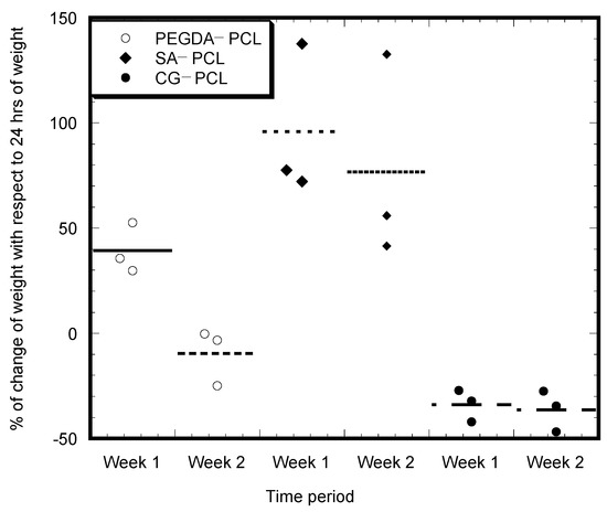 The CG1-PCL scaffold demonstrated a consistent degradation from the first week, whereas there was an increase of weight due to absorption of water for the SA-PCL scaffold during the two-week study period (Figure 10). The study observed degradation of PEGDA-PCL scaffold during the second week. Unlike PEGDA-PCL and SA-PCL, CG1-PCL did not absorb fluid during the period of degradation analyses. However, degradation data indicate a decrease of architectural integrity with time. All samples showed degradation from the 1st week to the 2nd week, with the highest values for PEGDA-PCL samples, then SA-PCL. There is a negligible amount of degradation observed for CG1-PCL samples during the 2-week soaking period.