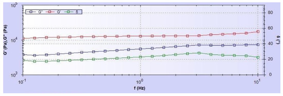 A representative image showing the elastic, viscous and phase shift angle variation during the constant strain rate frequency sweep test at 25 °C. In the image, G′, G″ and δ are the elastic, viscous and phase shift angle, respectively.