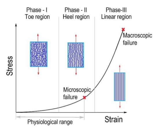 - The initial region of the stress-strain response, i.e., phase-I (toe region). The soft tissue’s mechanical behaviour in this region is similar to a soft isotropic rubber sheet. The collagen fibres are in a relaxed state, and they appear wavy and crimped. Therefore, very low stress is required for attaining large deformation without stretching the collagen fibres. As a result, the mechanical behaviour in phase-I is approximately linear, and the elastic modulus is low (0.1–2 MPa) [,].