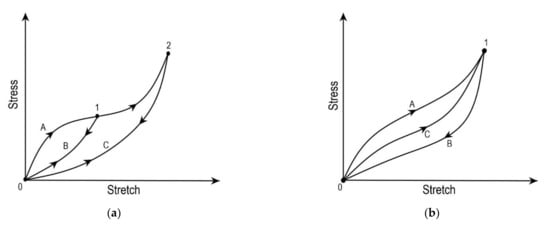 Damage in the soft tissues occurs when the applied load goes beyond the physiological range, as shown in Figure 2. The physiological limit of the soft tissue lies in phase-II []; when the applied load exceeds this limit, the damage at the microscopic level initiates, resulting in microscopic failure. Damage in a material is a progressive physical phenomenon that leads to failure, as shown in Figure 2. Experimental studies have reported four phenomena associated with the damage in soft tissues: (a) Mullins effect, (b) hysteresis, (c) permanent set, and (d) rupture [,]. Under the cyclic loading of soft tissue, the stress required after the first cycle for the same stretch reduces for the consecutive cycles (Figure 4a). This stress softening phenomenon in materials under cyclic loading is known as the Mullins effect []. The maximum load governs the Mullins effect during the loading cycles. In the literature, the Mullins effect is extensively studied by several authors on arteries [,], vaginal tissue [], etc. The continuous softening of the material subjected to cyclic loading under constant load is known as hysteresis (Figure 4b). The softening phenomenon continues until a saturation point is reached [,,,,]. Hysteresis is used to precondition the soft tissues at lower loads to overcome the shape effects in experimental tests [,]. Hysteresis studies are often reported for arteries by Pena et al. [] and Balzani et al. [,]. The inelastic behaviour that occurs due to accumulated strain in the soft tissue due to load is known as the permanent set []. This phenomenon is also studied extensively for soft tissues as with arteries [,] and bioprosthetic heart valves []. Lastly, the accumulated microscopic damage in the tissue leads to a macroscopic failure known as rupture. The tissue rupture may arise due to the failure of the matrix or rupture in fibres. In the literature, rupture studies are reported in arteries [,], corneas [,], skin [], ligaments [], etc.