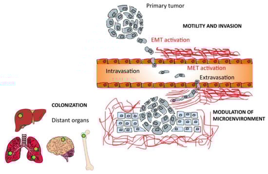 Hallmarks of the metastatic process: Neoplastic cells migrate from the primary tumor and start to invade through surrounding stroma via a multiple motility mechanisms (as single cells via EMT). Single cells once entered into the vasculature (intravasation) roll along the endothelium and selectively adhere to endothelium or stop when the vessel diameter is too small to traverse. Adhesion tumor cells exit vessels (extravasation), the ECM is reorganized and can result in the release of matrikines that affect tumor cell and/or stromal behavior. This activated environment results permissive for proliferation and colonization of secondary sites. Disseminating cells selectively colonize several tissues and the process of further dissemination (i.e., metastasizing from metastases) can occur.