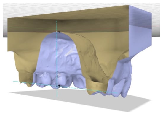 Meshmixer® software was used to measure the palatal surface, defined as the surface bounded by the palatal–gingival contour of teeth from the first right molar to the first left molar and by a line connecting the distal surfaces of first molars. The palatal surface was selected with the “Select-Brush” function, then isolated from the entire model to be measured (Figure 3).