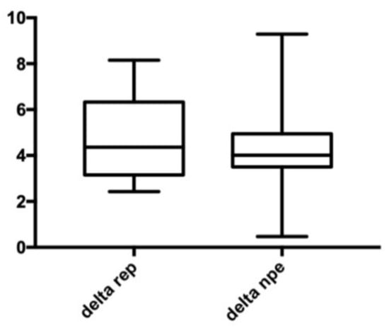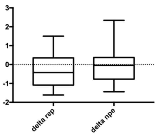 Posterior width. Delta REP is the variation in patients treated with RPE; Delta NPE-2 is the variation in patients treated with NPE-2; the numbers show the variation measured in millimeters.