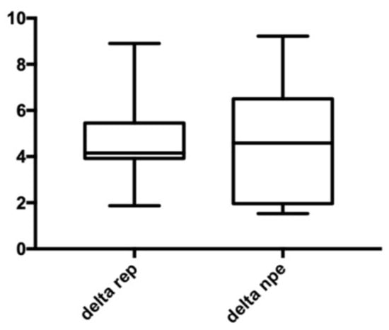 Palatal height. Delta REP is the variation in patients treated with RPE; Delta NPE-2 is the variation in patients treated with NPE-2; the numbers show the variation measured in millimeters.