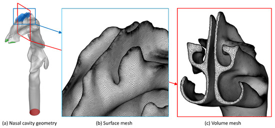Details of the nasal airway model: (a) Geometry, (b) Surface mesh, and (c) Volume mesh.