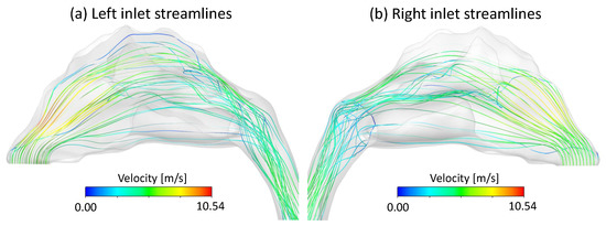Streamlines of airflow velocity: (a) Left inlet streamlines, and (b) Right inlet streamlines.